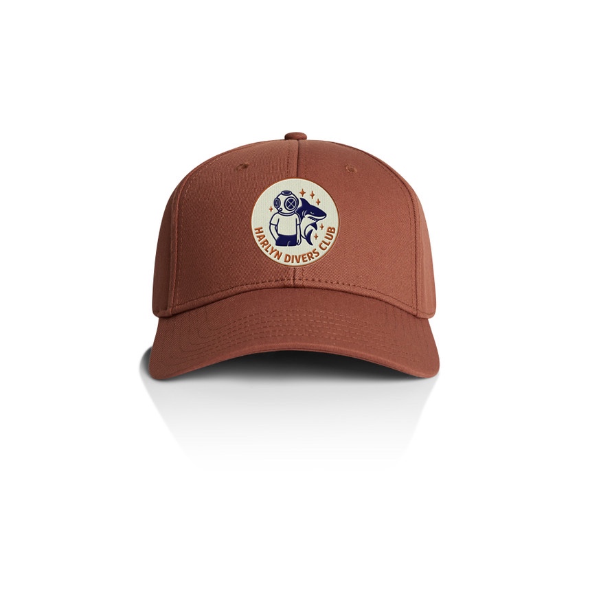 Mid-profile six-panel cap with curved peak. Embroidered Harlyn Divers Club patch to the front. Midweight 100% cotton.